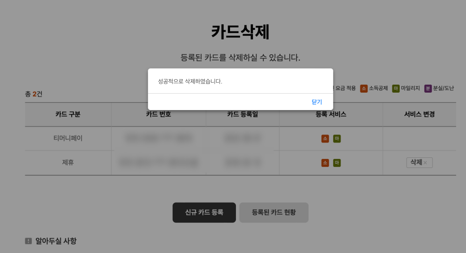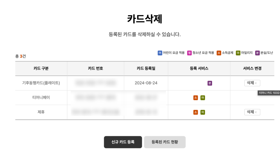 메뉴 - 나의 티머니 - 등록된 카드 현황 경로로 들어가